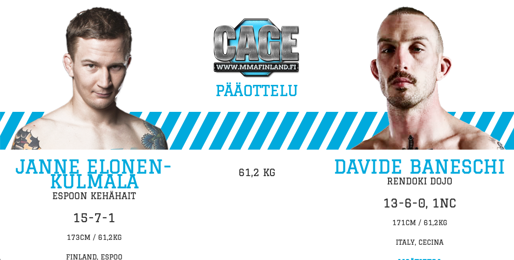 Italialaista mattotaituri Davide Baneschia vastaan otteleva Janne Elonen-Kulmala on rankattu Pohjois-Euroopan ykköseksi ja Venäjän 12:nneksi. Ylennys illan toisesta pääottelusta varsinaiseen pääotteluun tuli Elonen-Kulmalalle yllätyksenä.