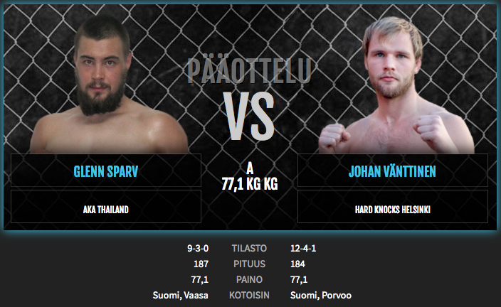 Helmikuussa välisarjan (-77,1 kg) CAGE-mestaruusvyön haltuunsa napannut Glenn Sparv (9-3-0) puolustaa nyt titteliään ensimmäistä kertaa. Vaasalaislähtöinen mestari joutuu kovaan testiin, sillä hänet haastaa huimassa vireessä oleva HardKnocks Helsinki -tiimin Johan Vänttinen (12-4-1).
